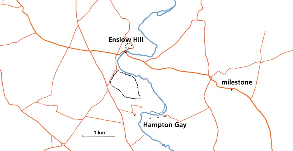 The milestone is a short distance beyond Islip, and measures fifty-eight miles from London. A few miles further west, at Enslow, the road crosses a bridge over the river Cherwell, after which it ascends a steep bank above the river.
