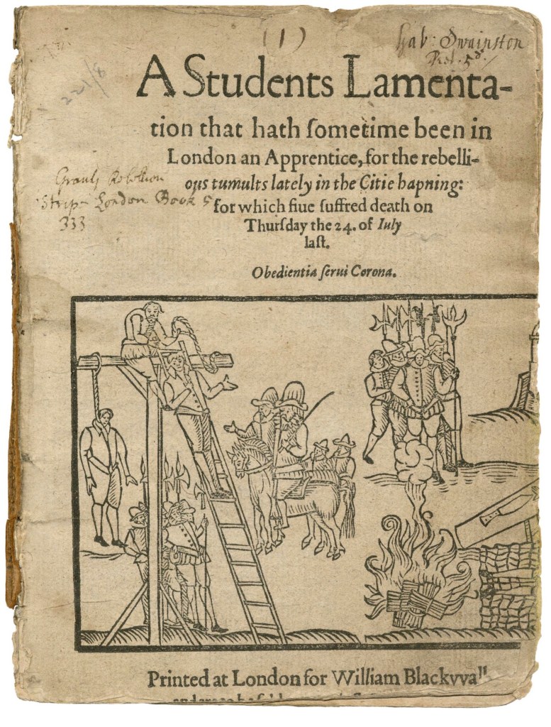 ‘[…] Examinations of Rich. Edey, porter of the Marshalsea, Henry Robinson, girdler, and Garret Saxton, shoemaker, all of Southwark. Edw. Flower, husbandman of Knightsbridge, being at Robinson’s shop door, said there was a great stir in London with the apprentices for the good of the Commonwealth; that 1,800 of them had pulled down the pillories in Cheapside and Leadenhall, and set up a gallows against the door of the Lord Mayor, whom they would hang if he dared come out, but he dared not; and that 3,000 were lying in the fields, with bills and clubs, to rescue the apprentices, if anything were done to them.’
