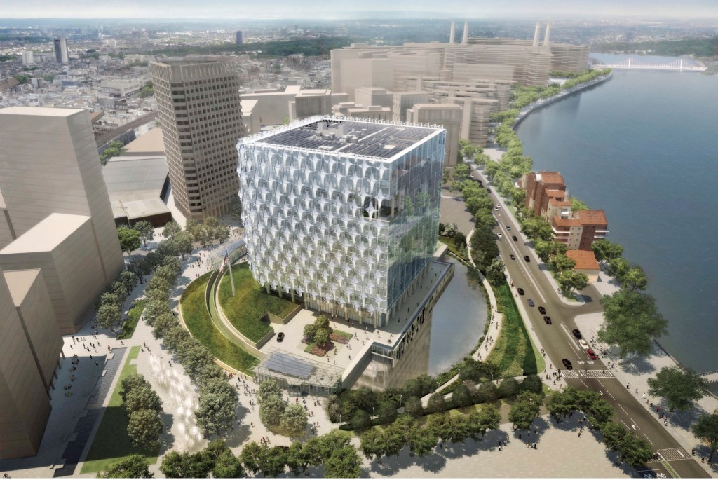 In 2008, the US State Department signed an agreement with real estate developer Ballymore to acquire a site for the construction of a new London embassy at Nine Elms, a previously industrial area on the south bank of the Thames, west of the city’s centre. When the result of an architectural competition was announced in 2010, critics noted the winning design’s resemblance to a medieval castle keep. Martin Filler described it as ‘a twenty-first-century avatar of the Tower of London’.8 James Timberlake of winning architects KieranTimberlake was reported to have said that the building’s defensive strategy was inspired by the design of European castles, in that it would be achieved by shaping the surrounding landscape.
