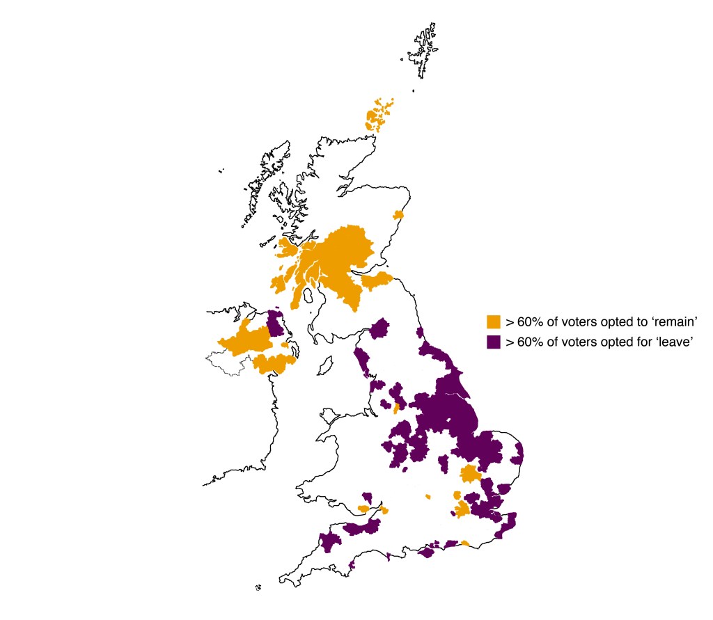 This geological distinction has many historical and economic aspects, notably the centralisation of political and financial power in London and south-east England, especially during the Tudor period. The south-east/north-west distinction was particularly evident in the UK’s recent referendum on membership of the European Union: the great majority of the areas in which more than 60 per cent of voters opted to leave are in the south-eastern half of the island.