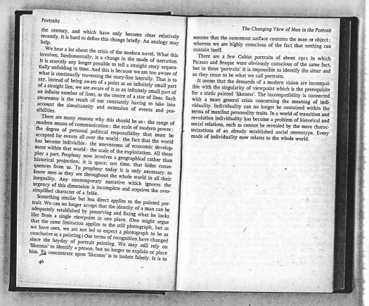 ‘We hear a lot about the crisis of the modern novel. What this involves, fundamentally, is a change in the mode of narration. It is scarcely any longer possible to tell a straight story sequentially unfolding in time. And this is because we are too aware of what is continually traversing the story-line laterally. That is to say, instead of being aware of a point as an infinitely small part of a straight line, we are aware of it as an infinitely small part of an infinite number of lines, as the centre of a star of lines. Such awareness is the result of our constantly having to take into account the simultaneity and extension of events and possibilities.