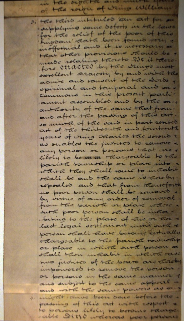 In the same year, the 1662 Settlement Act was amended by An Act to prevent the Removal of Poor Persons until they shall actually become chargeable.
