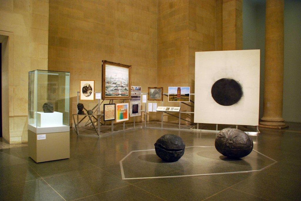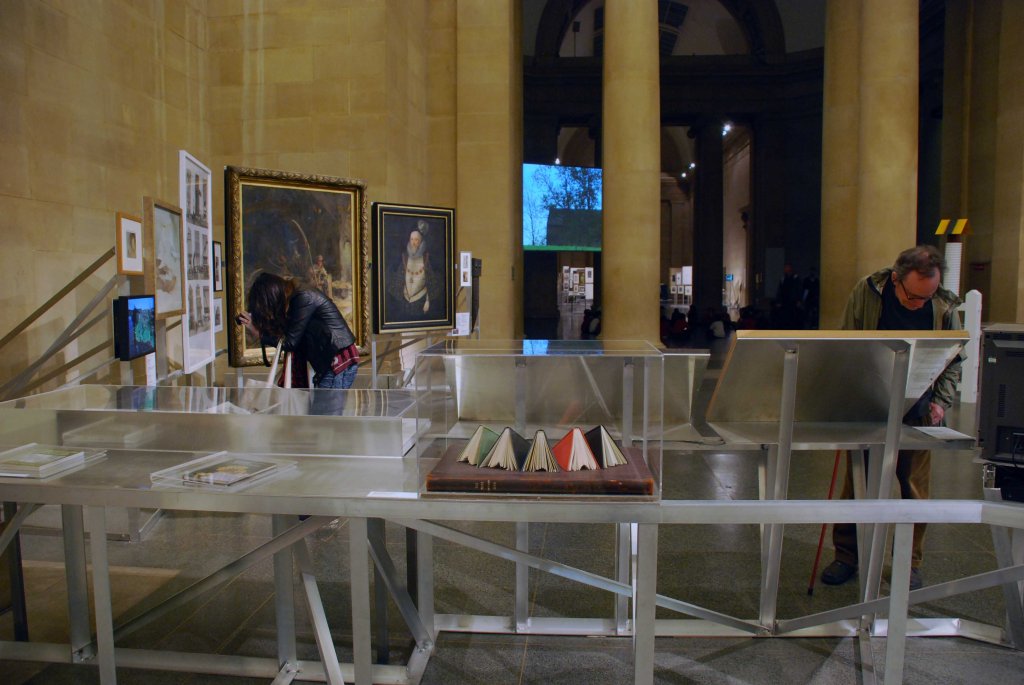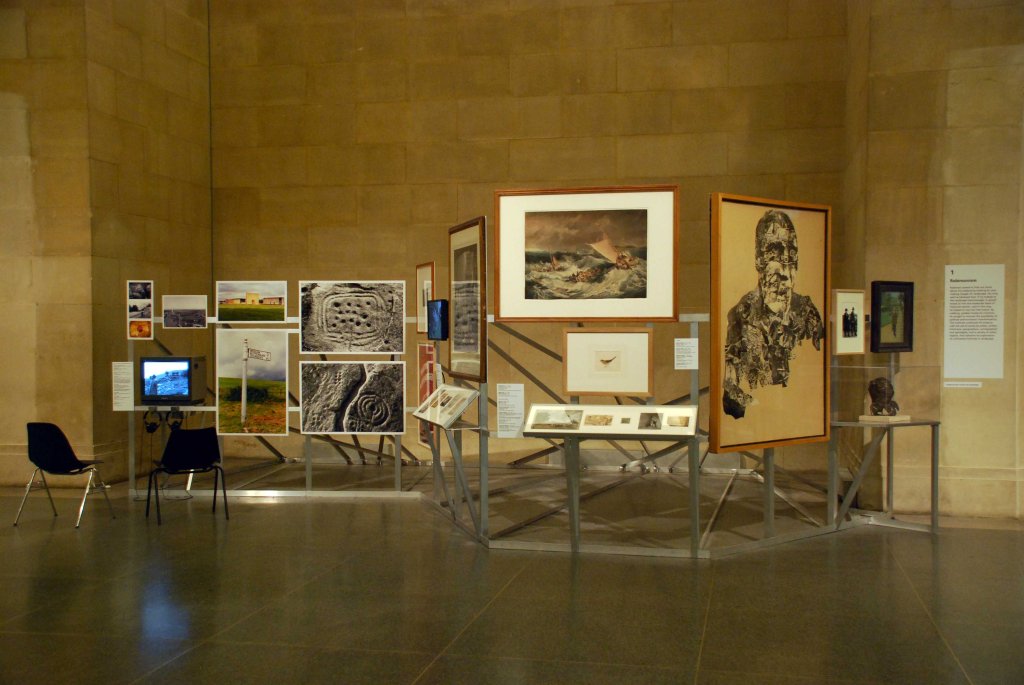 The Robinson Institute was created to continue the work of a fictional itinerant scholar known as Robinson. In the spring of 2008, he had ‘surveyed the centre of the island on which he was shipwrecked: “the location,” he wrote, “of a Great Malady, that I shall dispel, in the manner of Turner, by making picturesque views, on journeys to sites of scientific and historic interest.”‘ In an attempt to avert global catastrophe, he set out with an ancient cine camera, hoping to trigger the end of neoliberalism by going for a walk. A year later, a box containing nineteen film cans and a notebook was discovered in a derelict caravan. Having already arranged some of the box’s contents as a film, Robinson in Ruins, the Institute’s researchers revisited Robinson’s journey to devise their inaugural exhibition. Artists’ works, many from Tate’s collection, together with a variety of other exhibits, were displayed alongside sequences of film footage, extending the now absent cinematographer’s interpretation of ongoing economic and environmental crisis.
